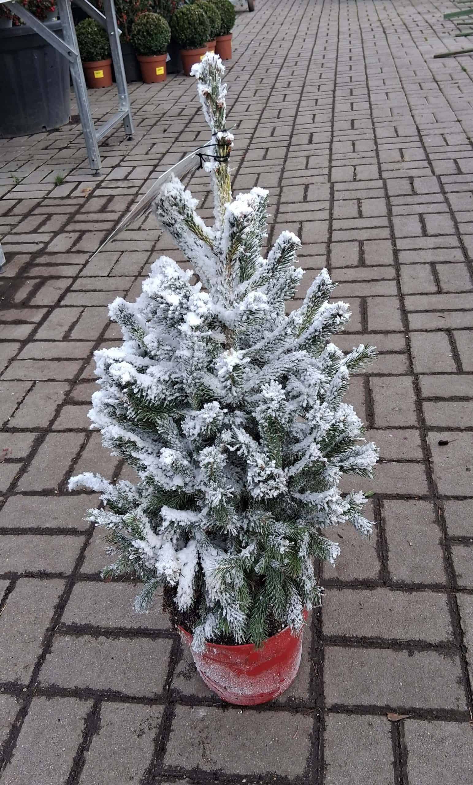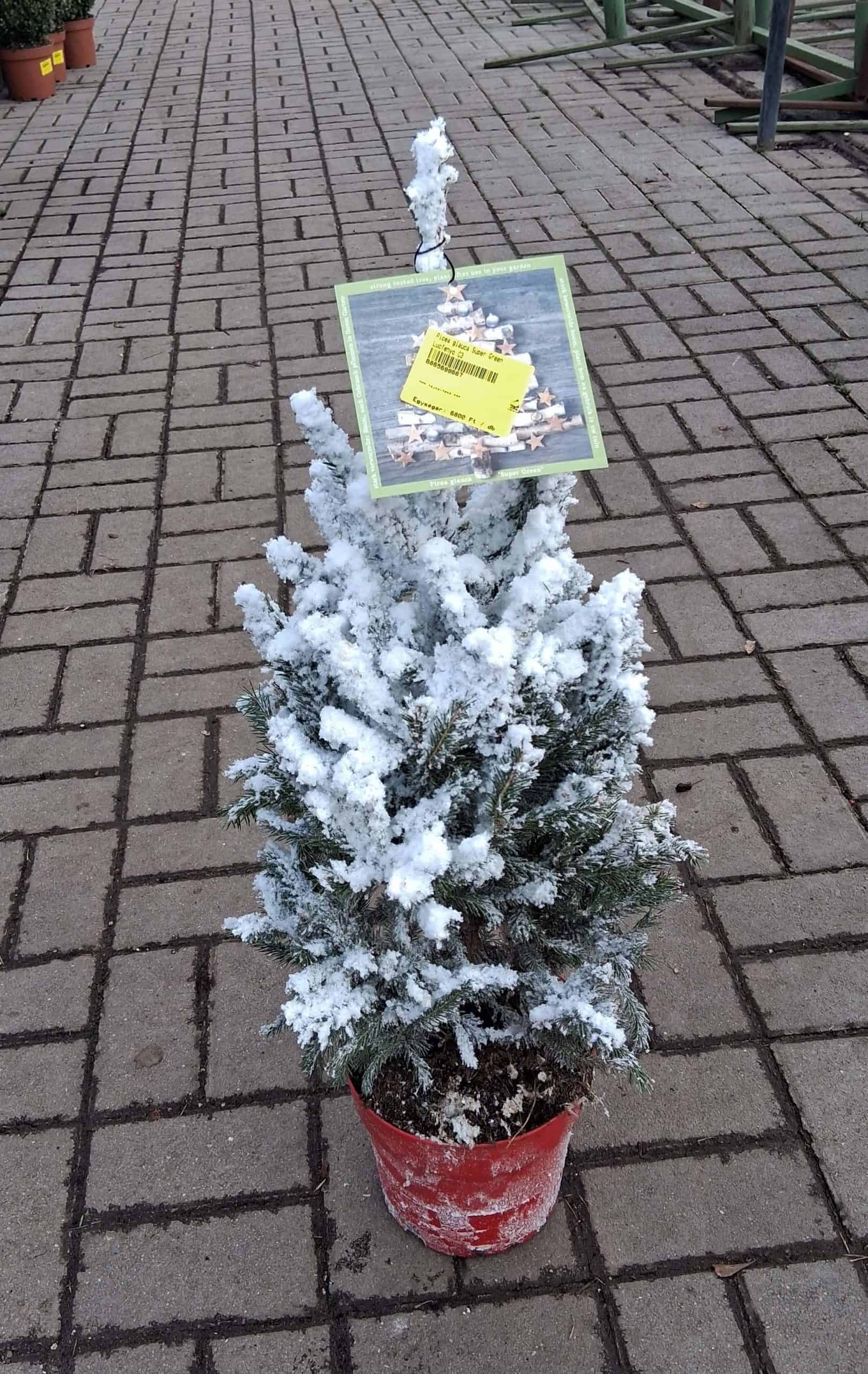 Élő Picea glauca ‘Super Green’ lucfenyő, műhóval lefújva a természetes havas hatásért. Stílusos, valódi karácsonyi dekoráció bármely térbe.